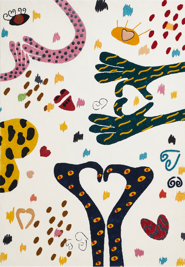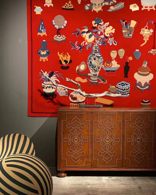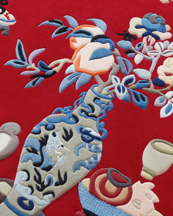 艺术家受民间“八宝图”灵感的启发,选取寓意吉祥、健康和财富的传统元素,如宝瓶、蟠桃、金鱼、寿菊、笔山,带来这块红红火火的“利是毯”。