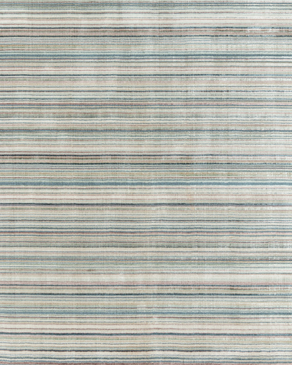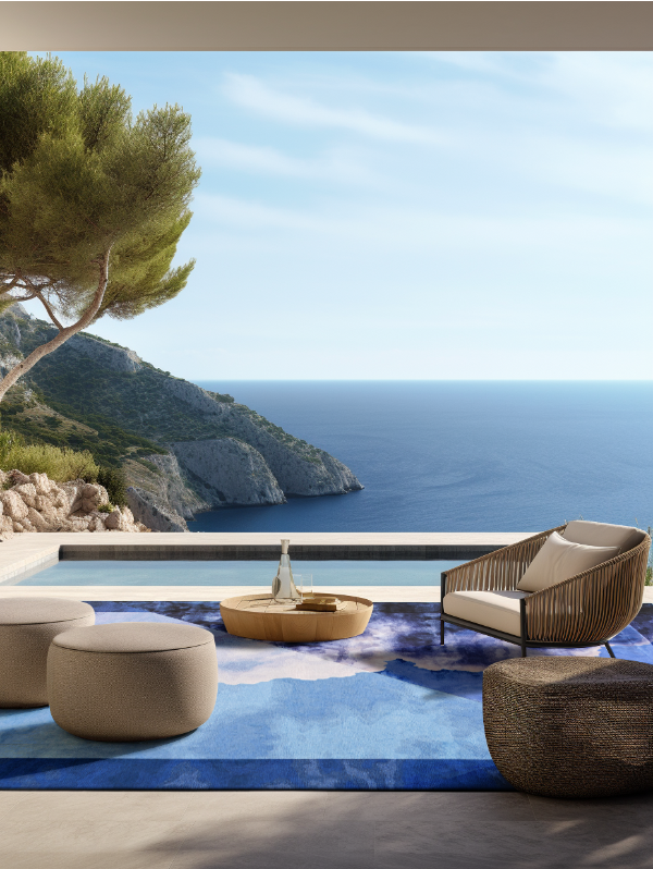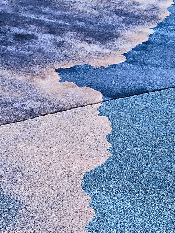 自然并非总是晴空万里,云雾瞬息万变。织毯定格了浮云遮天的前奏,又或是乌云消散的末尾,观者自有联想。蓝色的变调,经由高割低圈愠色与材料巧妙临摹,明暗层次丰富。设计师构思了画框式的织毯边缘,若作为挂毯,云天意象沉浸于不同风格居室兼合理。
