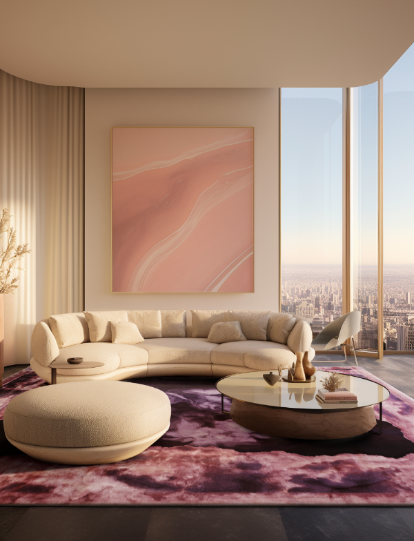 人用电闪雷鸣投射人生的颠沛,这幅织毯恰切地定格这个激烈的瞬间,为空间注入强烈的视觉冲击力。紫色粉色融合一体,紫色作为室内空间相对小众的颜色,成就魅影。由此,脱胎于闪电意象的图案成为了风格本身,独具一格。