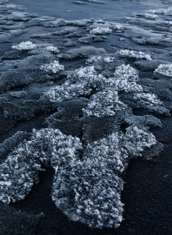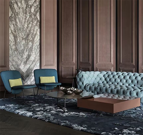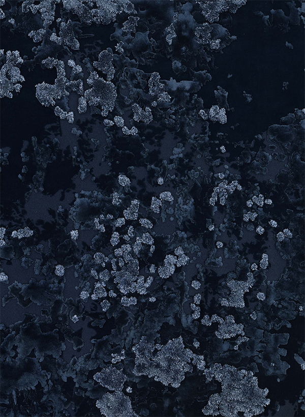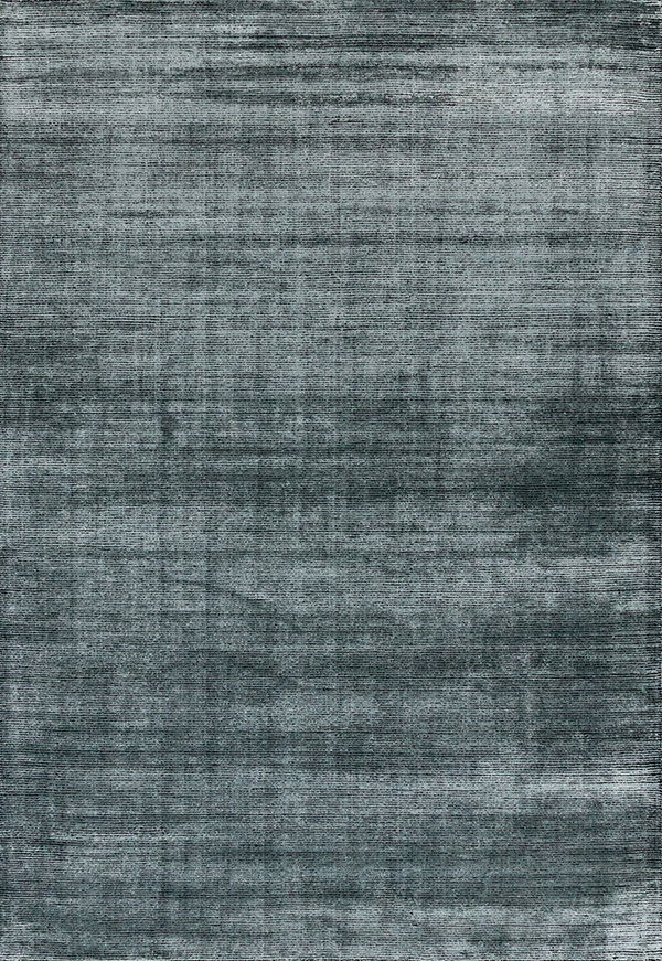 织毯描绘了浓重的山丘夜色,不同丝料与羊毛的混合形成渐变蓝调的对比,如连绵山峦与夜空模糊融合,明亮与深沉的色调也因材质不同各具质感。在居室视野中流动着山丘的夜,化为人心的清净与安全感。
