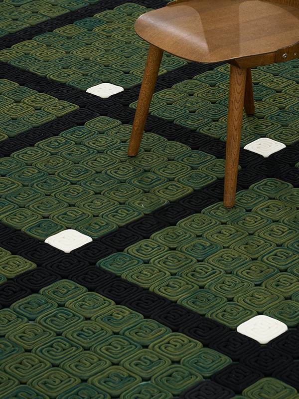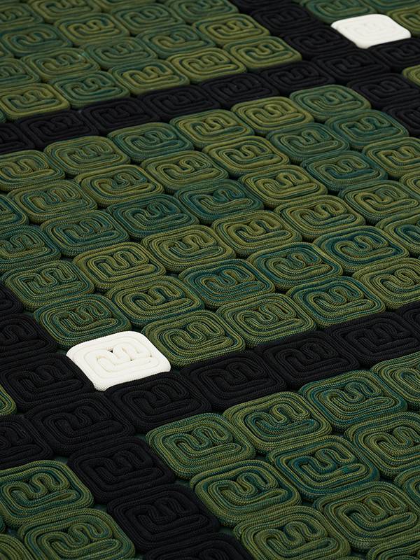 我们利用这种具有数学思维的设计方法运用到地毯中,将此方法跟绳索结合,发展成一种具体涉及一种模块化构件及地垫物的实用新型的地毯。我们将圆绳在一个方形底板上环绕出一个符号化的形状,用有序排列的方式将每一个同样形状的模块组织在一起,变成具有整体性的视觉化地毯。