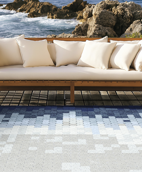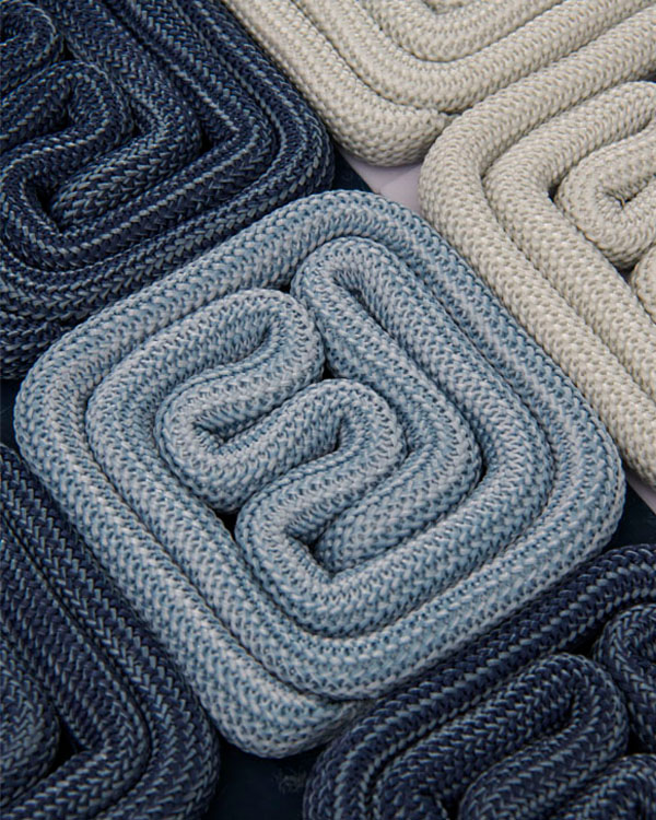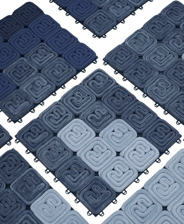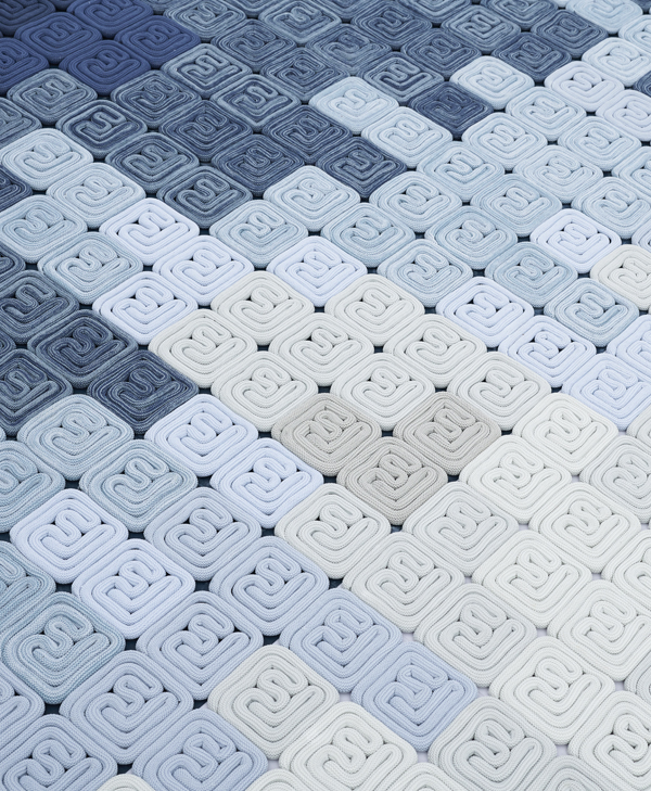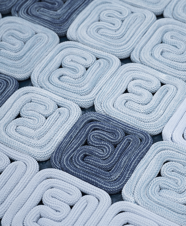 我们利用这种具有数学思维的设计方法运用到地毯中,将此方法跟绳索结合,发展成一种具体涉及一种模块化构件及地垫物的实用新型的地毯。我们将圆绳在一个方形底板上环绕出一个符号化的形状,用有序排列的方式将每一个同样形状的模块组织在一起,变成具有整体性的视觉化地毯。
