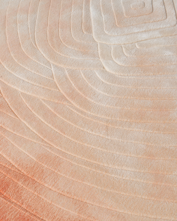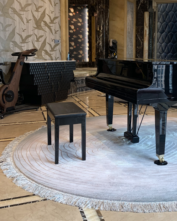 方与圆既承载着中国古老的智慧,又引渡了西方的理性几何。地毯以圆心为支点,向外延伸成椭圆形,既有精神世界的感觉,又不失中国的设计理念。远远望去,这块羊毛地毯犹如滴水入海的涟漪。