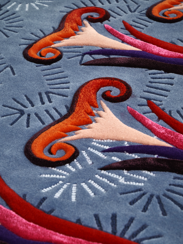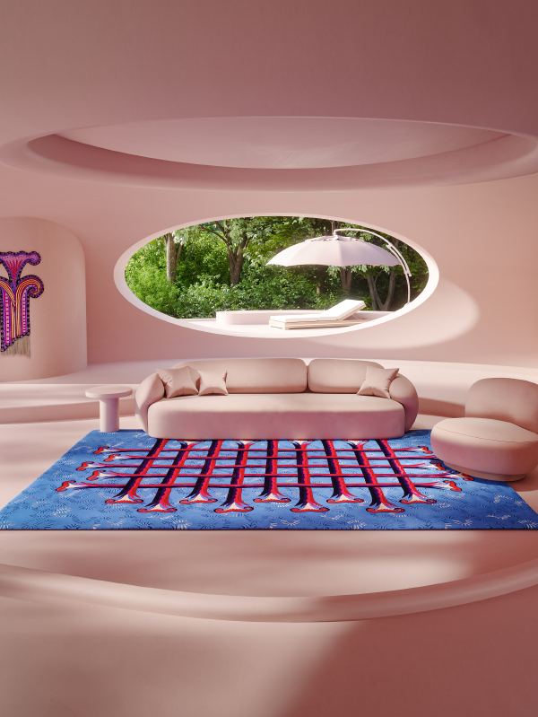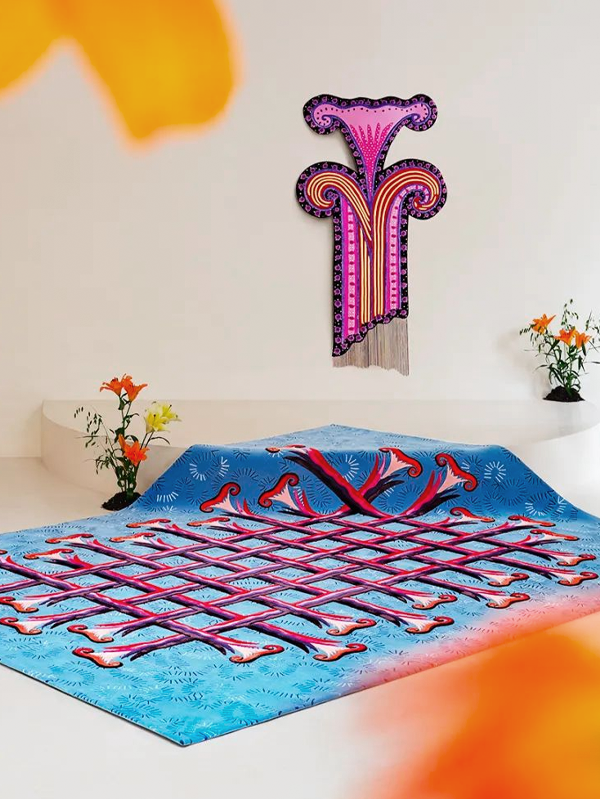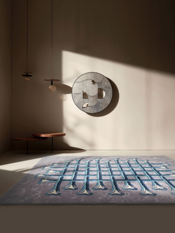百合对于桑德拉女爵来说象征着美好的友谊,在此次与FULI的合作中,桑德拉⼥爵将百合图案投⼊再次创作,在地毯设计上,她将数个百合图案互相交织,形成曼妙的格纹图案。