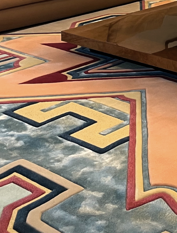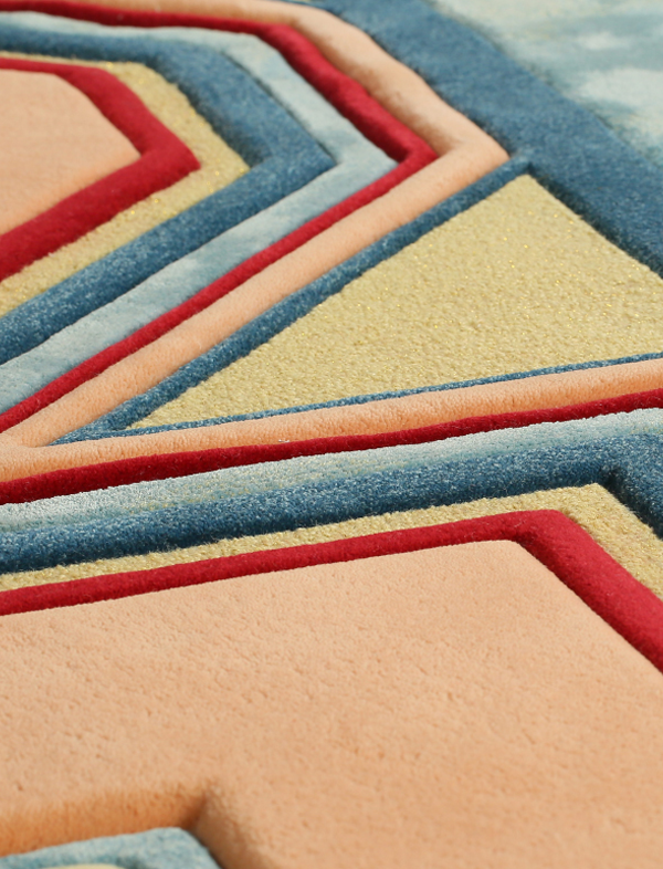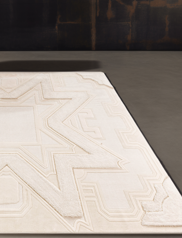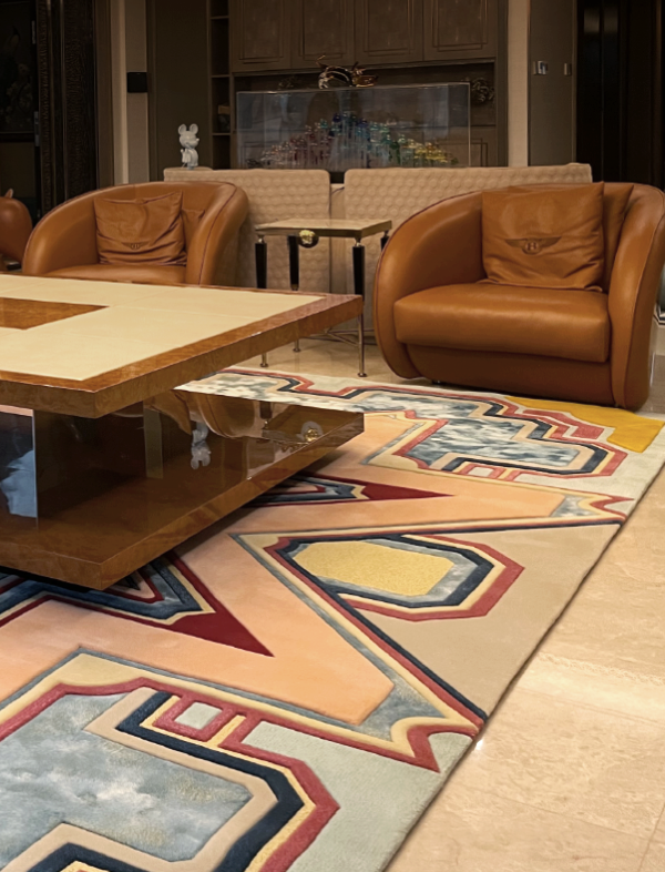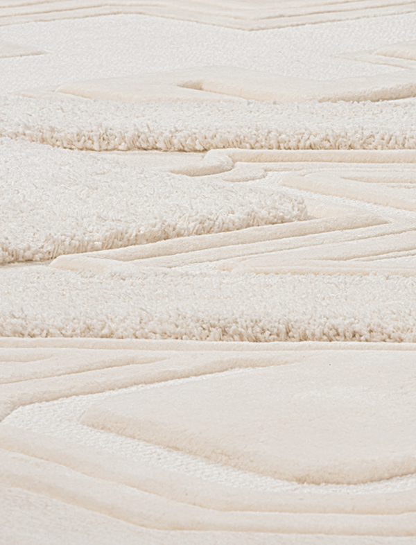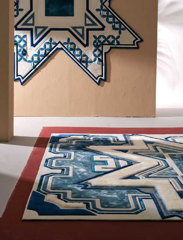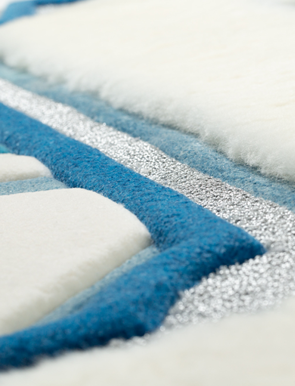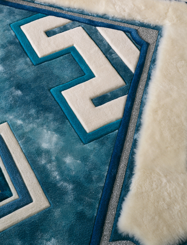 设计师将基诺尼宫殿内部泳池融入到织毯的创作中,长方形的地毯犹如阳光下的泳池,树影摇曳,形成了细碎的几何形状。中⼼部分⽤丝晕染出整个⽔⾯的波光粼粼。特别是⽩⾊的⽔底雕塑采⽤整块⽪⽑镶嵌,让毯⾯更为丰富,珍稀。
