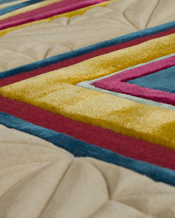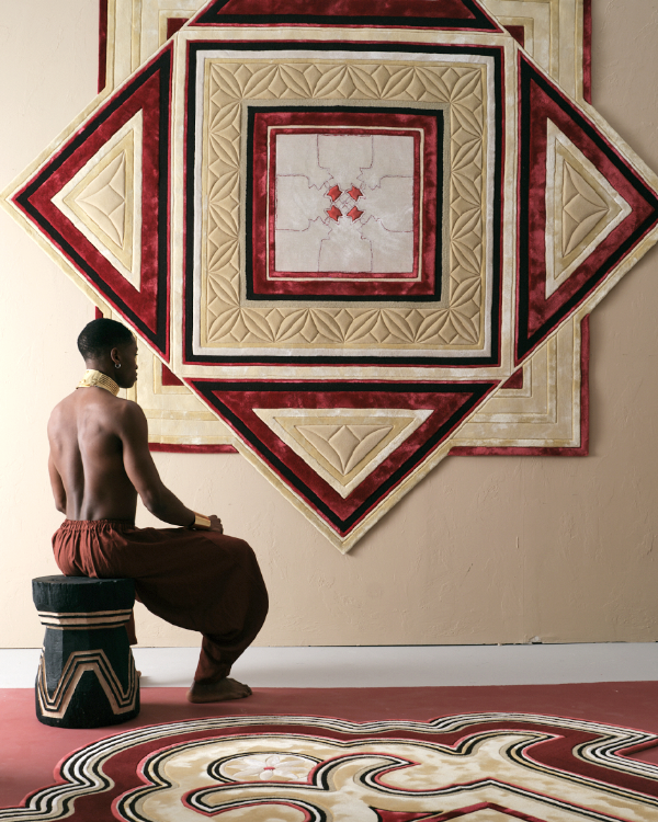 基诺宫殿内部客房卧室,卧榻的侧⾯墙上有两个正⽅形叠组成⼋⻆形状浮雕图案,形似⼀张捕梦⽹,捕捉着⼀夜⼜⼀夜的美丽梦境。KULALA挂毯的设计灵感也取⾃于此。在相对规整形态的挂毯处理上,FULI在线条更为笔直的朱红部分就⽤丝来布局,让内部被包裹的⽺⽑雕刻更为突出。